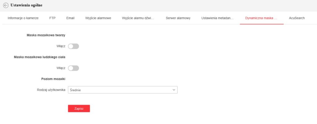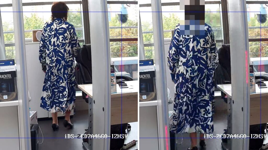 Kamery Hikvision oferują możliwość blurowania twarzy lub sylwetki za pomocą efektu mozaiki. Model iDS-2CD7A46G0-IZHSY (platforma H8) daje możliwość maskowania twarzy osoby/sylwetki w podglądzie na żywo oraz na nagranym materiale. Niestety w tej serii kamer nie jest możliwe, aby odwrócić tę funkcjonalność. Nałożona maska zostaje już na nagraniu.