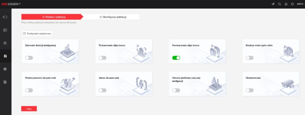 Zacznij od zalogowania się do panelu administracyjnego kamery (zrób to przez przeglądarkę lub rejestrator). Następnie kliknij VCA i kolejno w zakładce Wybierz aplikację włącz suwakiem opcję Porównywanie zdjęć twarzy (obraz 1). Wejdź w zakładkę Skonfiguruj aplikację (obraz 2), następnie Ustawienia ogólne i Dynamiczna maska mozaikowa (obraz 3). W zależności czy chcesz zastosować maskę twarzy czy maskę całej sylwetki włącz suwakiem odpowiednią opcję (Maska mozaikowa twarzy/Maska mozaikowa ludzkiego ciała). W ostatnim kroku zatwierdź i aktywuj maskę.